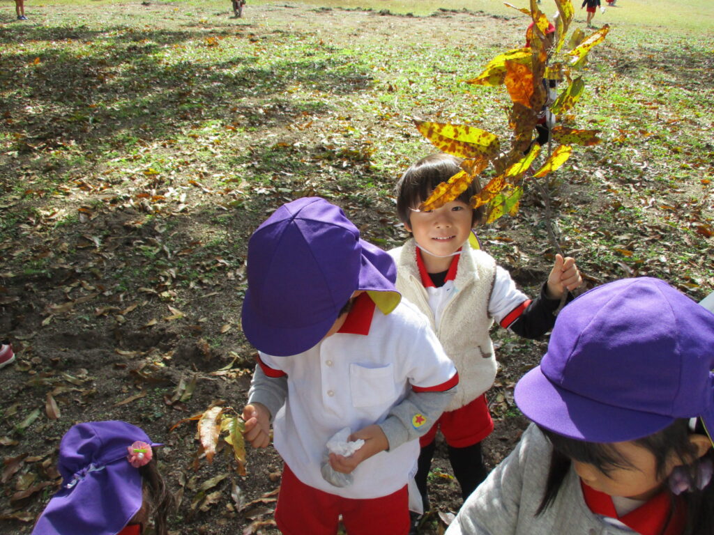 別の場所に移動すると、沢山落ちていて、一生懸命松ぼっくりやどんぐりの種類を探したり、色のついた葉っぱをみつけたりして、秋🍁を感じることができたようです。