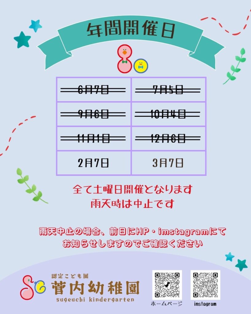 雨天時は中止となります。多くのご参加お待ちしております😊(雨天中止の際は、前日にこちらからとインスタグラムよりお知らせします)